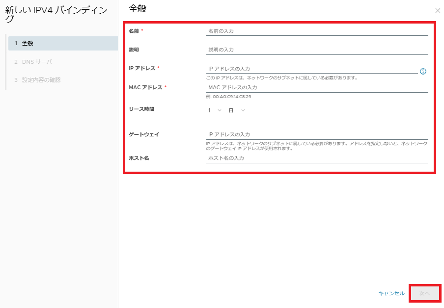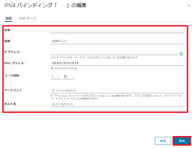- [1 全般]にてIPv4バインディング設定を行います。事前に対象仮想マシン NICのMACアドレスを控えて下さい。設定項目は以下となります。