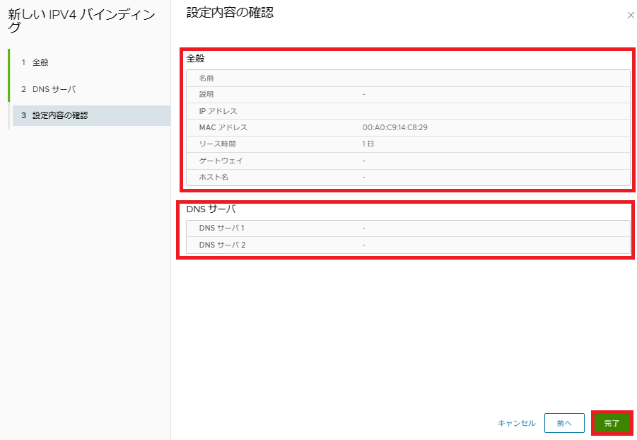 - [3 設定内容の確認]にてIPv4バインディング設定を確認します。確認完了後、[完了]をクリックすることでバインディング設定が生成されます。