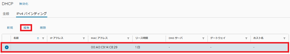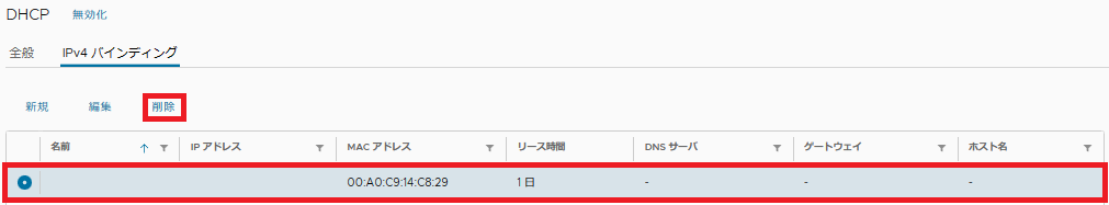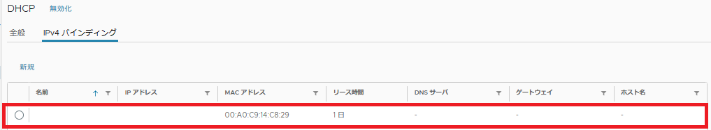 - [DHCP]->[IPv4 バインディング]をクリックします。