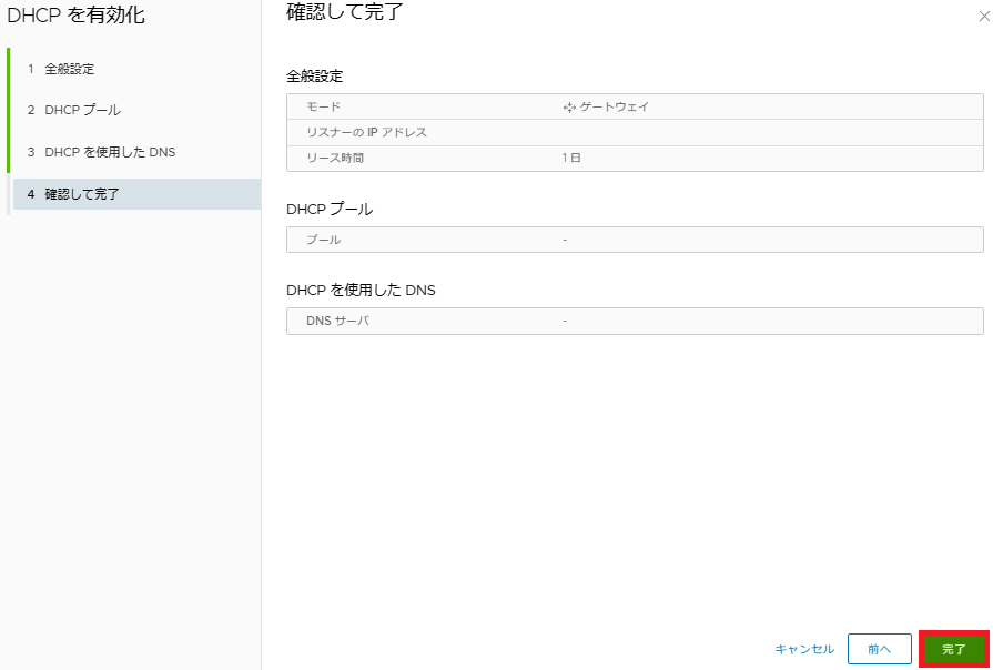 - [4 確認して完了]にて設定内容を確認し、[完了] をクリックします。DHCPサービス構成が有効化され、設定情報が[DHCP]内に反映されます。