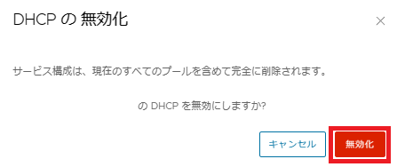 - [DHCPの無効化]ダイアログが表示されます。無効化対象に誤りがないことを確認し[無効化]をクリックします。