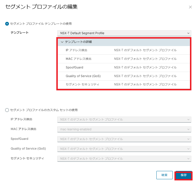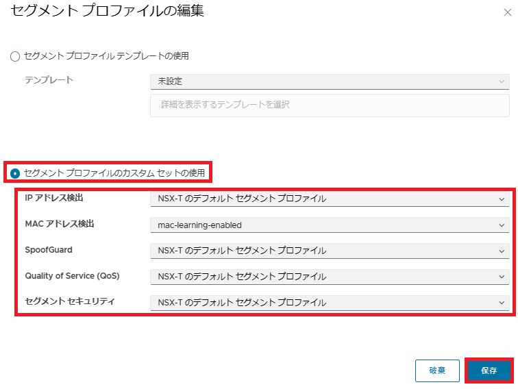 - [セグメントプロファイルの編集]ダイアログにて「セグメント プロファイルのカスタム セットの使用」にチェックし各項目を変更します。編集完了後、[保存]をクリックします。
