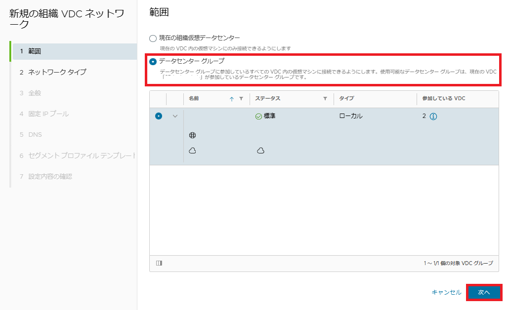 [範囲] 画面で [データセンターグループ] を選択し、作成するOvDCネットワークが接続するデータセンターグループを選択し[次へ] をクリックします。