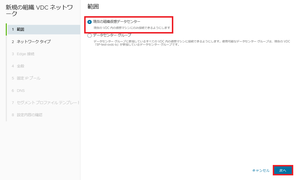[1 範囲] 画面で [現在の組織仮想データセンター] を選択し[次へ] をクリックします。
