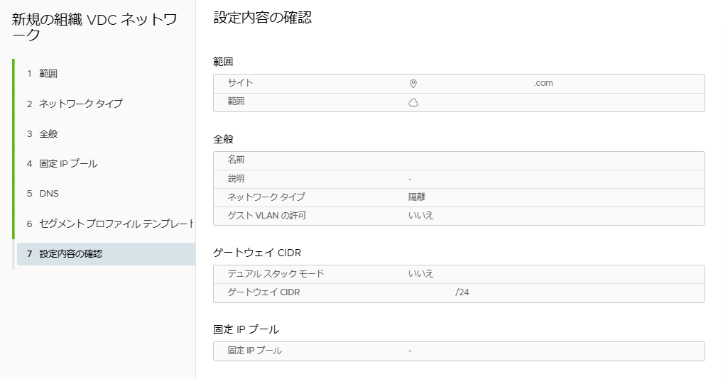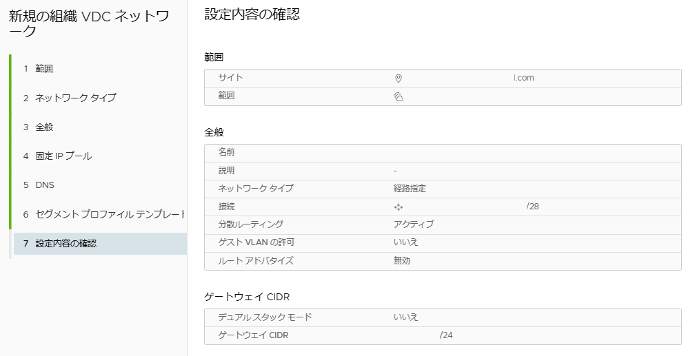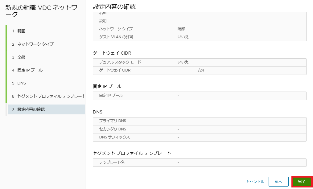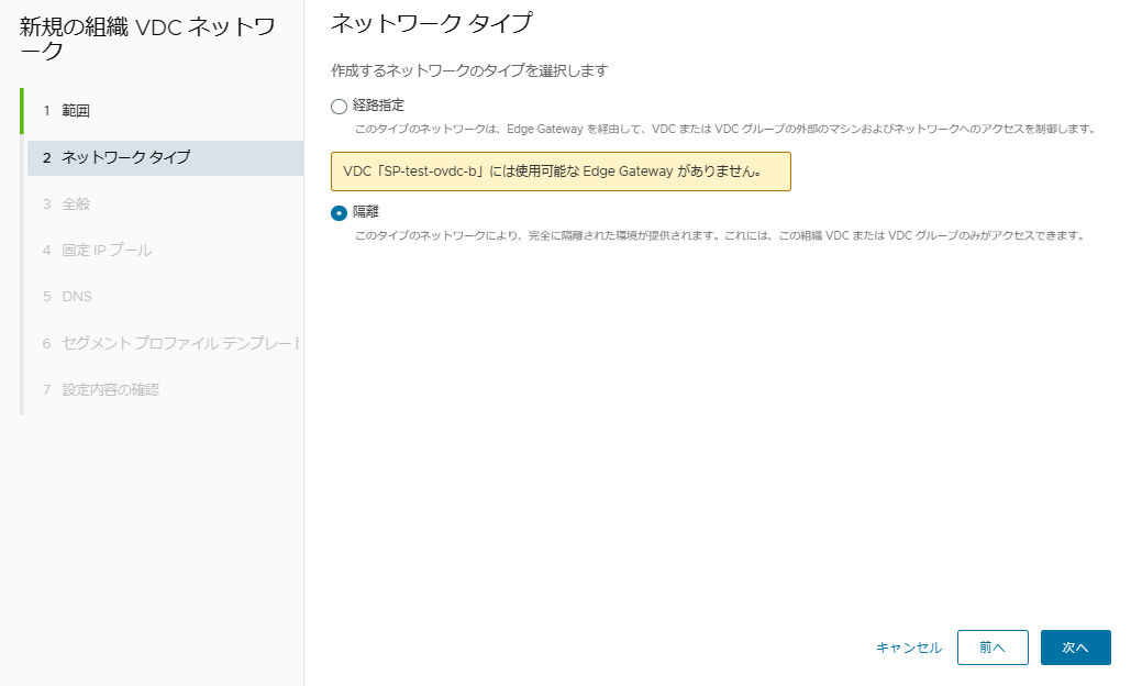 隔離型OvDCネットワーク作成時(現在の組織仮想データセンターでの作成時)