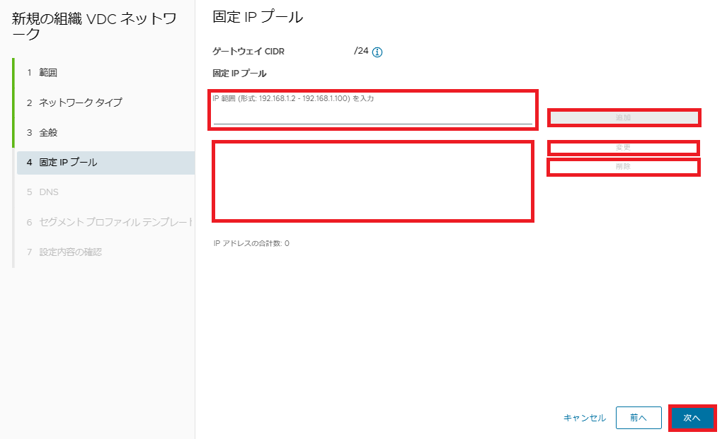 - 固定IPアドレスが必要な仮想マシンへの割り当て用に1つ以上のIPアドレスを予約するには、[4 固定IPプール]にてOvDCネットワークに固定IPを構成します。※オプション※複数の固定IPアドレスまたは固定アドレス範囲を追加するには、繰り返し追加手順を実行します。設定した固定IPアドレスおよび固定IPアドレス範囲を変更または削除するには、[変更]または[削除]をクリックします。構成設定完了後、[次へ] をクリックします。