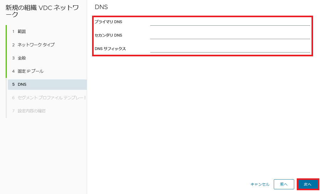 - OvDCネットワークのDNSを構成する場合は、[5 DNS]にてOvDCネットワークのDNS構成を行います。※オプションDNS構成にて設定する項目は以下となります。構成設定完了後、[次へ] をクリックします。