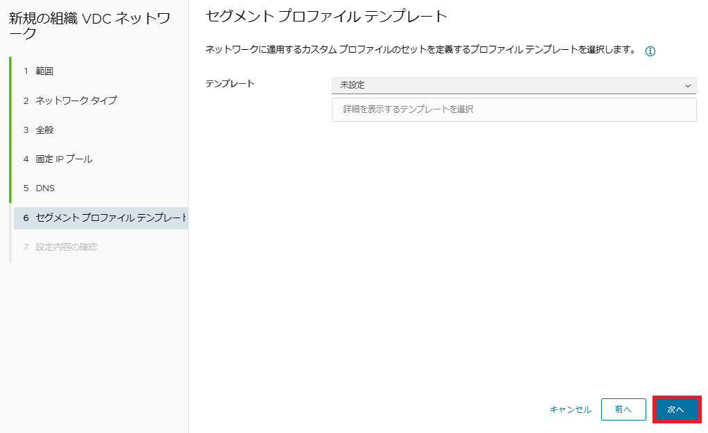 - [6 セグメントプロファイルテンプレート]にてOvDCネットワークに適用するセグメントプロファイルのセットを定義しているテンプレートを選択し、[次へ] をクリックします。