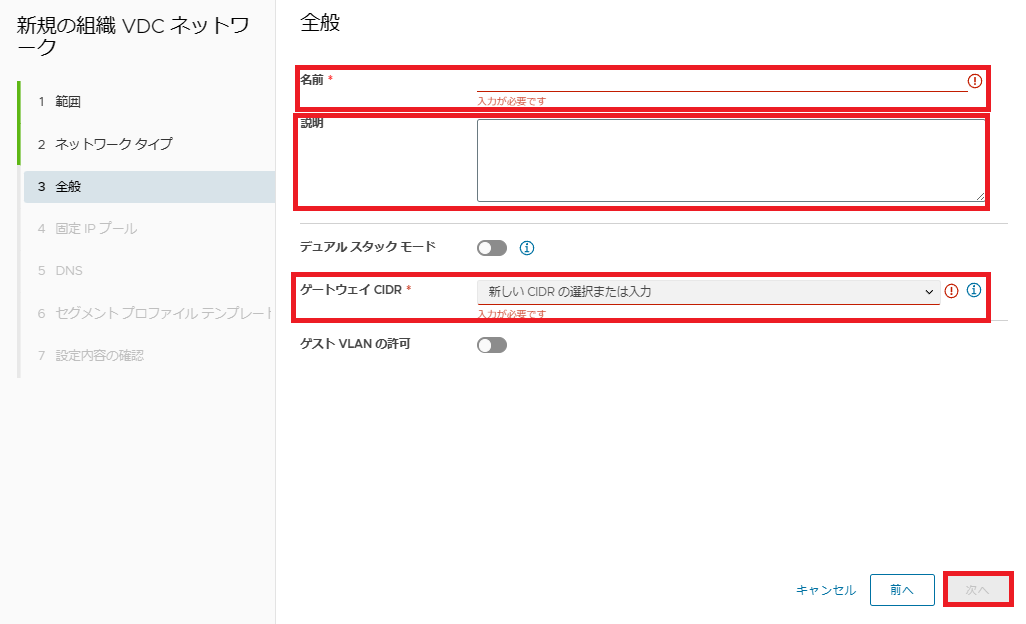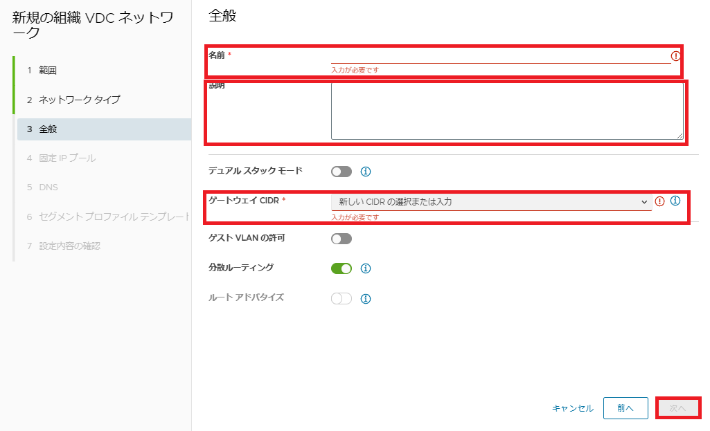 - [3 全般] 画面にてOvDCネットワーク作成に関する全般設定を行います。構成設定完了後、[次へ] をクリックします。