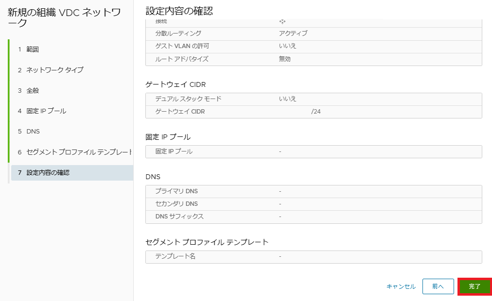 [7 設定内容の確認] 画面で設定内容を確認し、[完了] をクリックします。