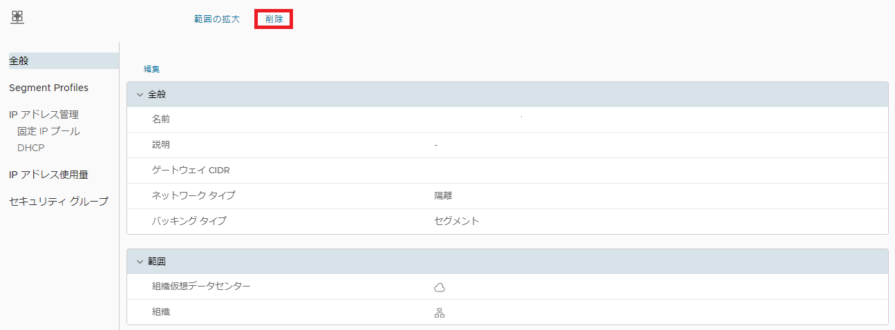 削除対象のネットワークであることを確認し、画面上部の[削除]をクリックします。