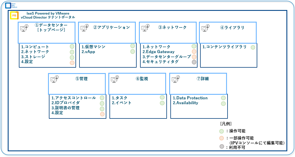 IPV管理用GUI(vCloud Director)ポータルは以下の画面で構成されています。