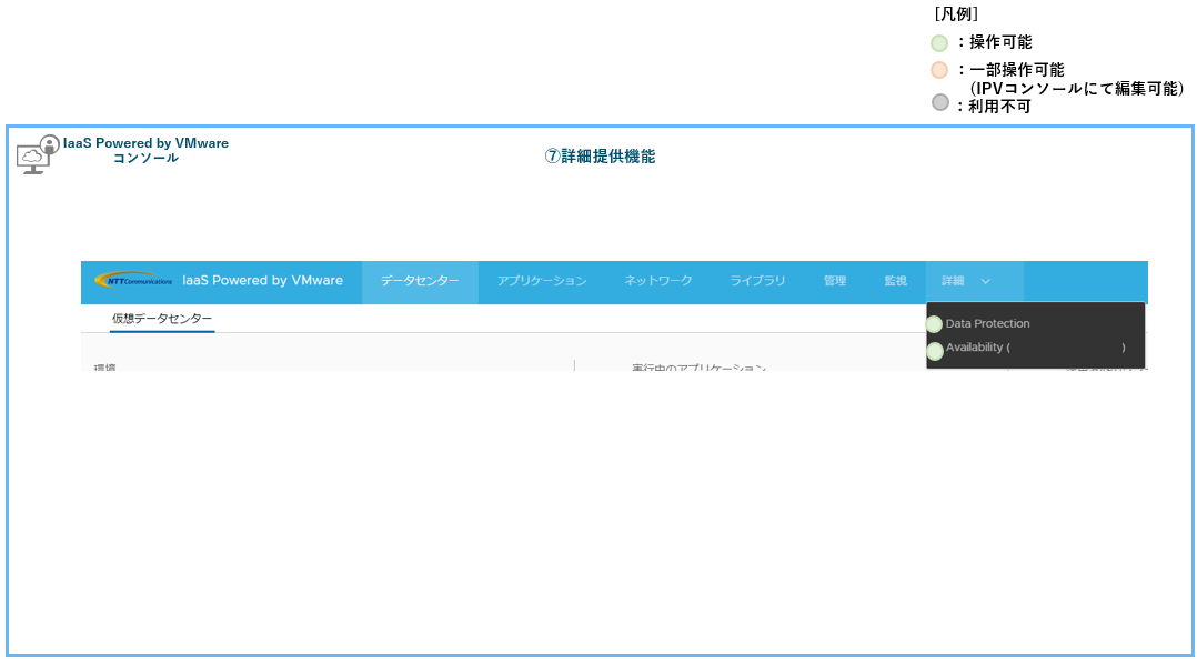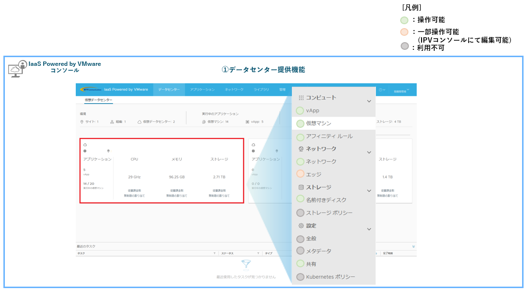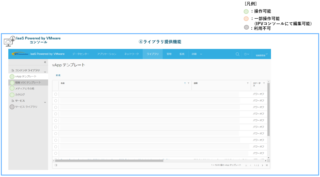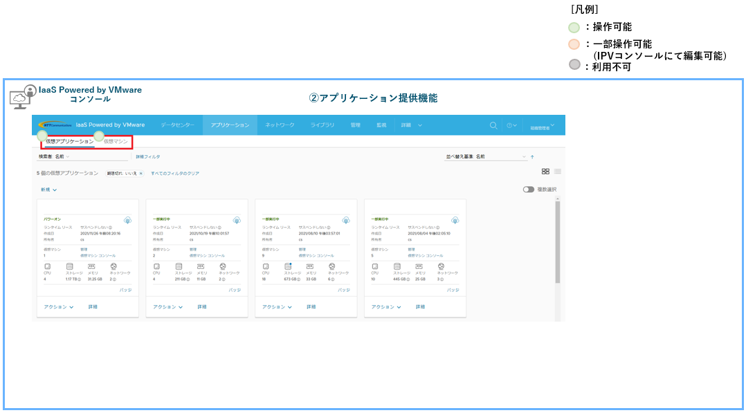 アプリケーションでは、データセンターにて作成した仮想システム(仮想マシン、vApp)の操作が行えます。