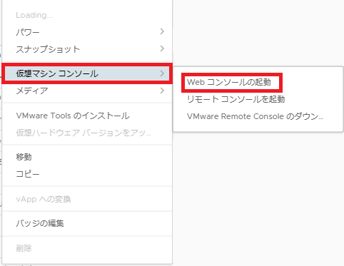 対象の仮想マシンの[アクション] -> [仮想マシン コンソール] -> [Webコンソールの起動] を押下し、管理者権限を持つユーザーとして仮想マシンのゲストOSにログインします。