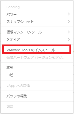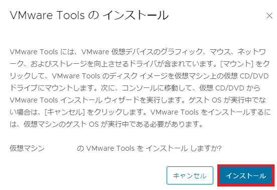- デスクトップがロードされたら、対象の仮想マシンの[アクション] -> [VMware Tools のインストール] を押下します。[VMware Tools のインストール]ダイアログが表示されます。VMware Toolsのインストールに関する説明を確認し、[インストール]をクリックします。