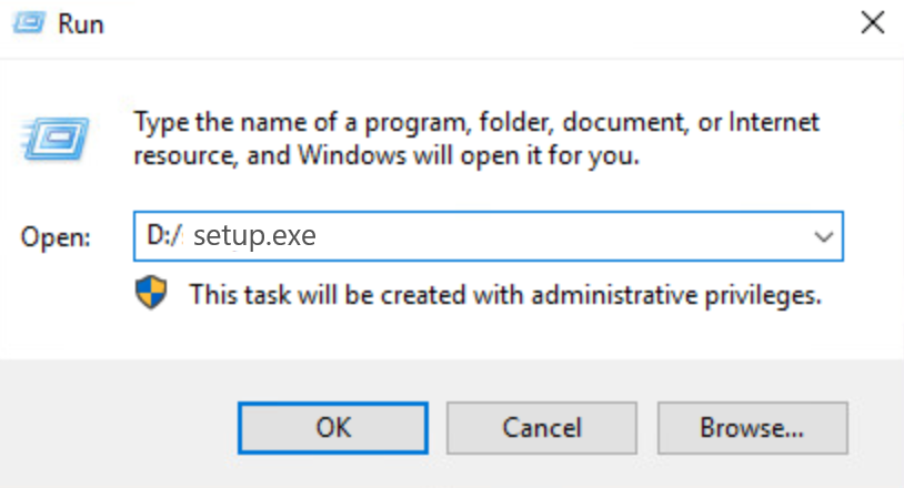 DVDドライブメニューが表示されなかった場合は、「Search Windows」から「Run」を押下し、「D:setup.exe」と入力して[OK]を押下します。