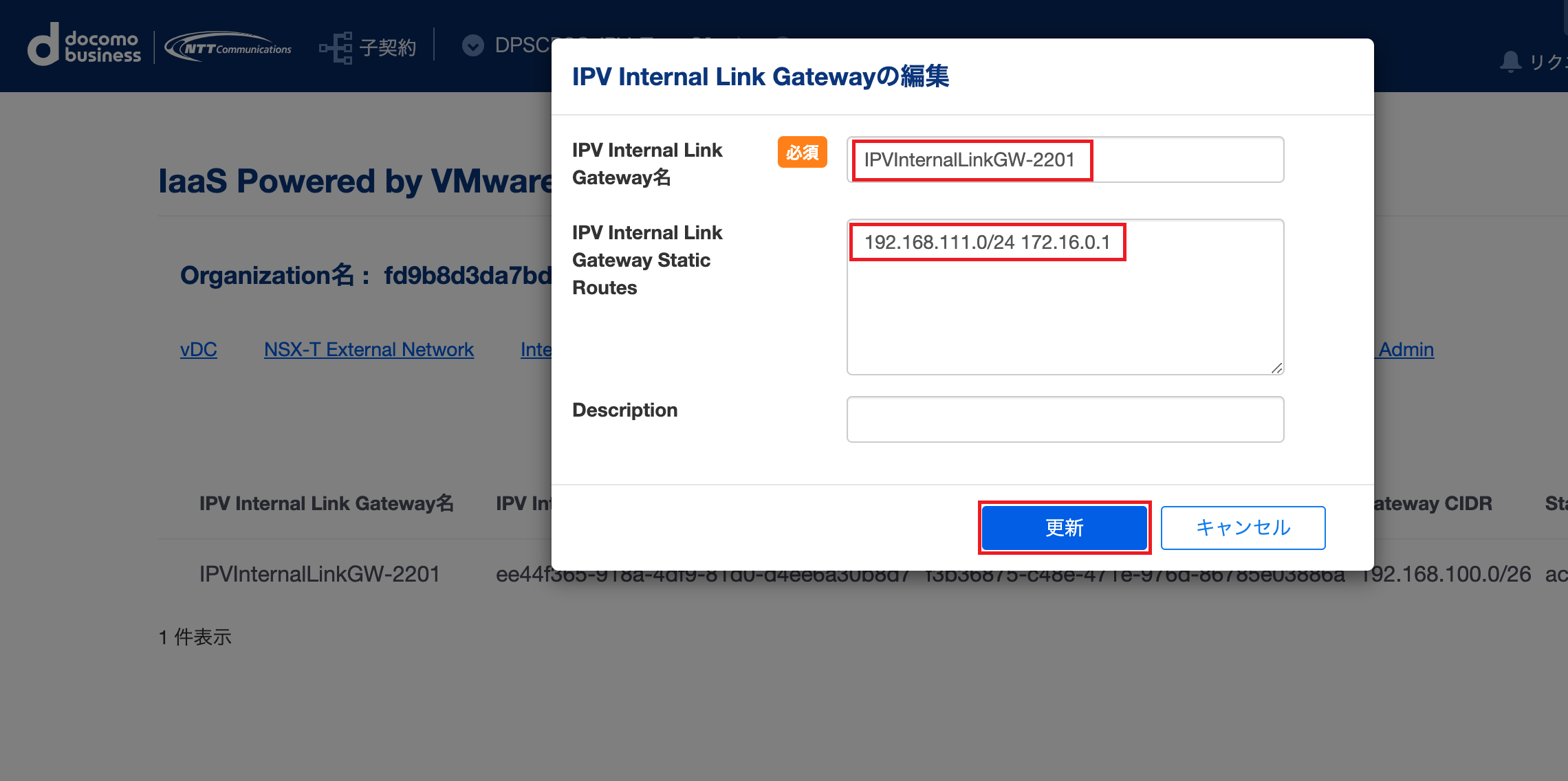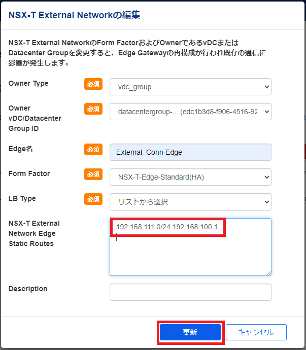 - 「NSX-T External Network Edge Static Routes」欄にスタティックルートを記載し「更新」ボタンをクリックします。