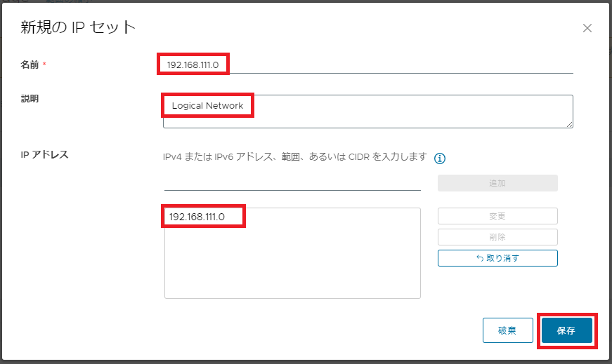 192.168.111.0/24 (リストから前記"IPセット"で作成したネットワークを選択する) |
