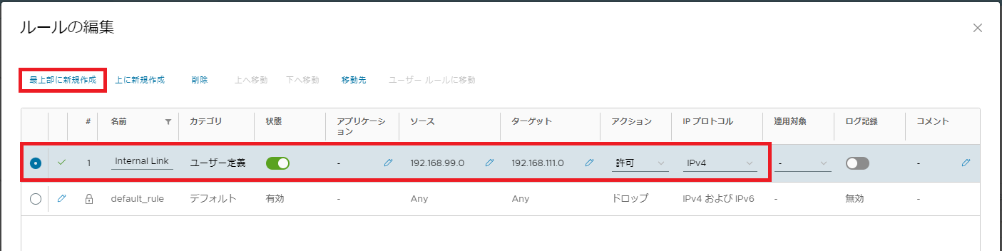 192.168.99.0/24 (リストから前記"IPセット"で作成したネットワークを選択する) |