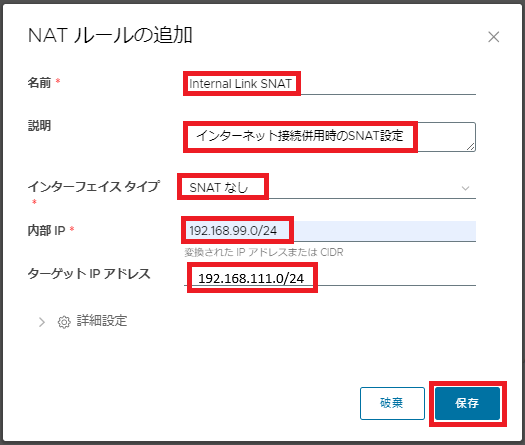 (9) NATルール(SNAT)作成 (Internet接続併用時のみ)¶