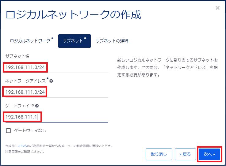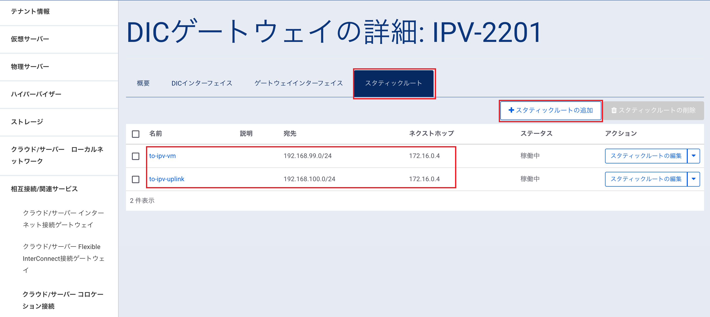 ※送信先ネットワーク(本ケースではロジカルネットワーク)とリージョン間接続(DIC)ゲートウェイのアドレスを記入