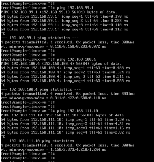 - OvDC上の仮想マシンにログインし、以下のコマンドにて各IPアドレスに対して疎通確認を行います。※以下記載例の仮想マシンはLinux OS搭載機です。仮想マシンの作成方法が不明な場合は こちらのリンク を参照して仮想マシンを作成後に疎通確認を行ってください。