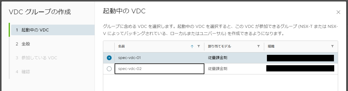 - [起動中のVDC]よりデータセンターグループを構築するOvDCを選択し、「次へ」をクリック
