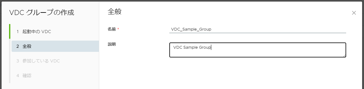 - 新しいデータセンターグループの「名前」と「説明」を入力し、「次へ」をクリック