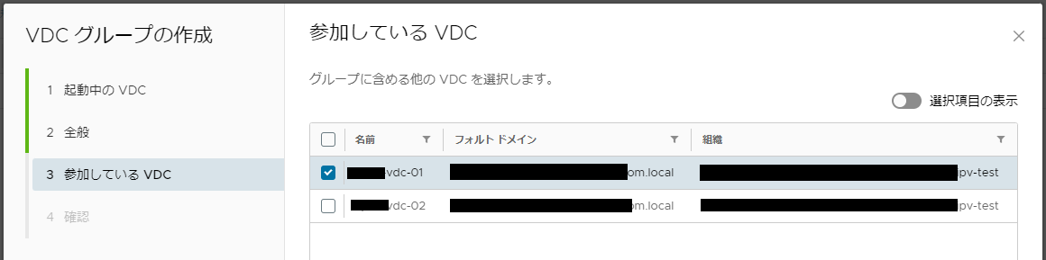 - [参加しているVDC] 画面で、新しいデータセンターグループに含めるデータセンターを選択して、[次へ] をクリック