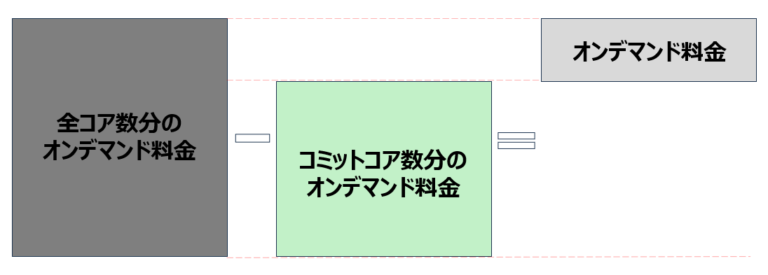 請求金額の計算式で「 {( 全コア数分のオンデマンド料金 ) ー ( コミットコア数分のオンデマンド料金 )}」のイメージは以下です。