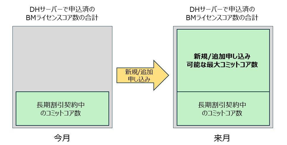 最大:(vSphere ESXi サーバーで申し込み済のベアメタルサーバーライセンスコア数の合計)ー(現時点で長期割引1年/3年契約中で来月のコミットコア数)