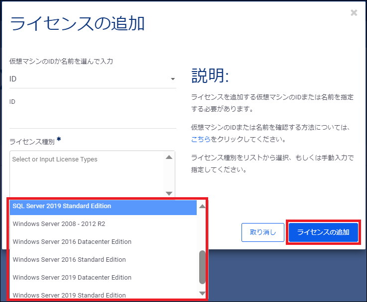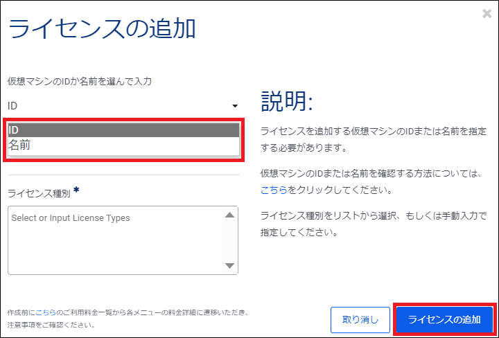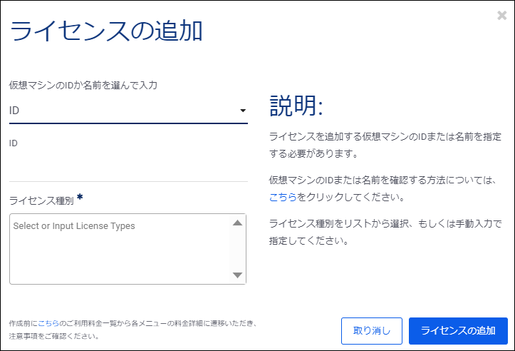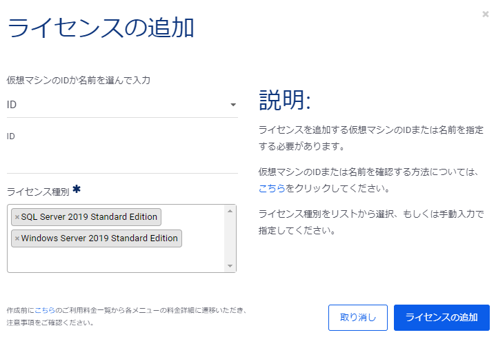 一度ライセンススイッチした仮想マシンに対して、ライセンスを追加・変更することはできません。追加するライセンスを誤った場合は、仮想マシンを再作成いただく必要がございます。