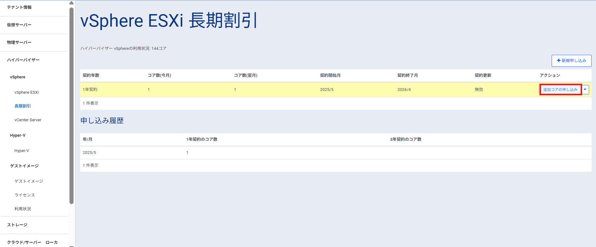 アクション列のプルダウンから「追加コアの申し込み」をクリックすることで、長期割引契約中の追加コアの申し込み画面に遷移します。