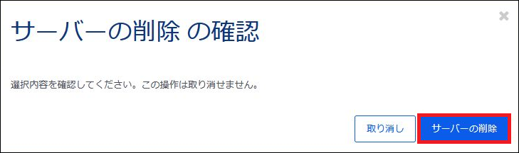 「サーバーの削除」の実行後、削除処理を止めることはできません。サーバー内のデータの復元も実施できませんのでご注意ください。