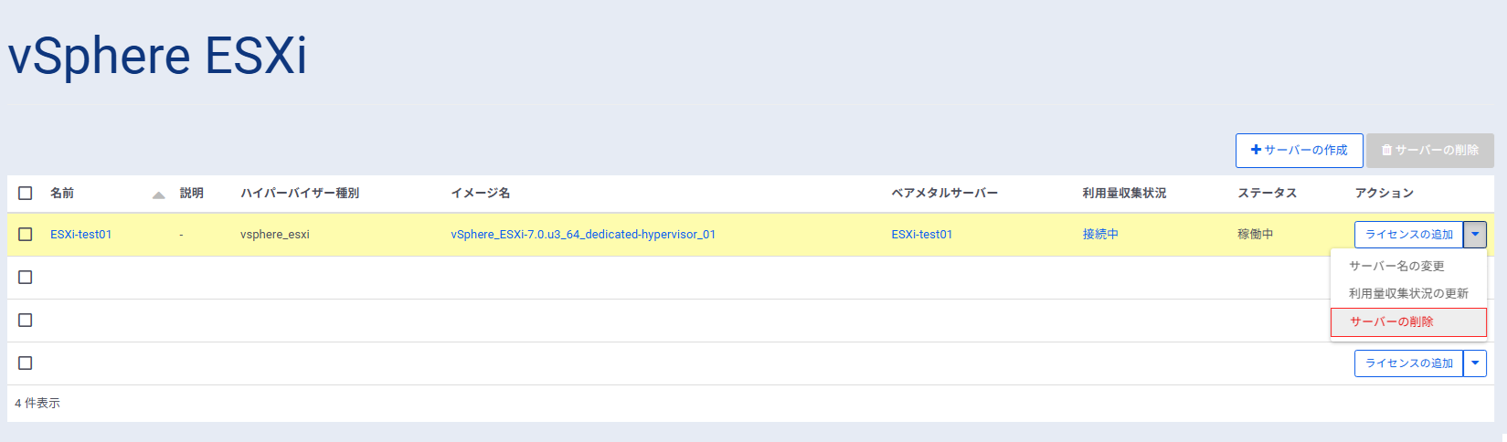 以下のサーバーリストから、対象のvSphere ESXi サーバー横にある サーバーの削除 を押下します。