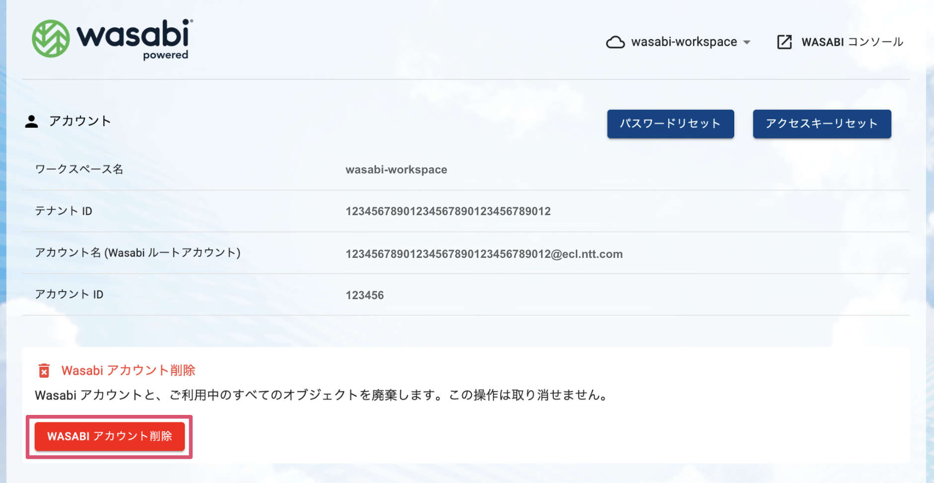Wasabi アカウントを削除すると Wasabi オブジェクトストレージに保管されているすべてのデータが削除されます。