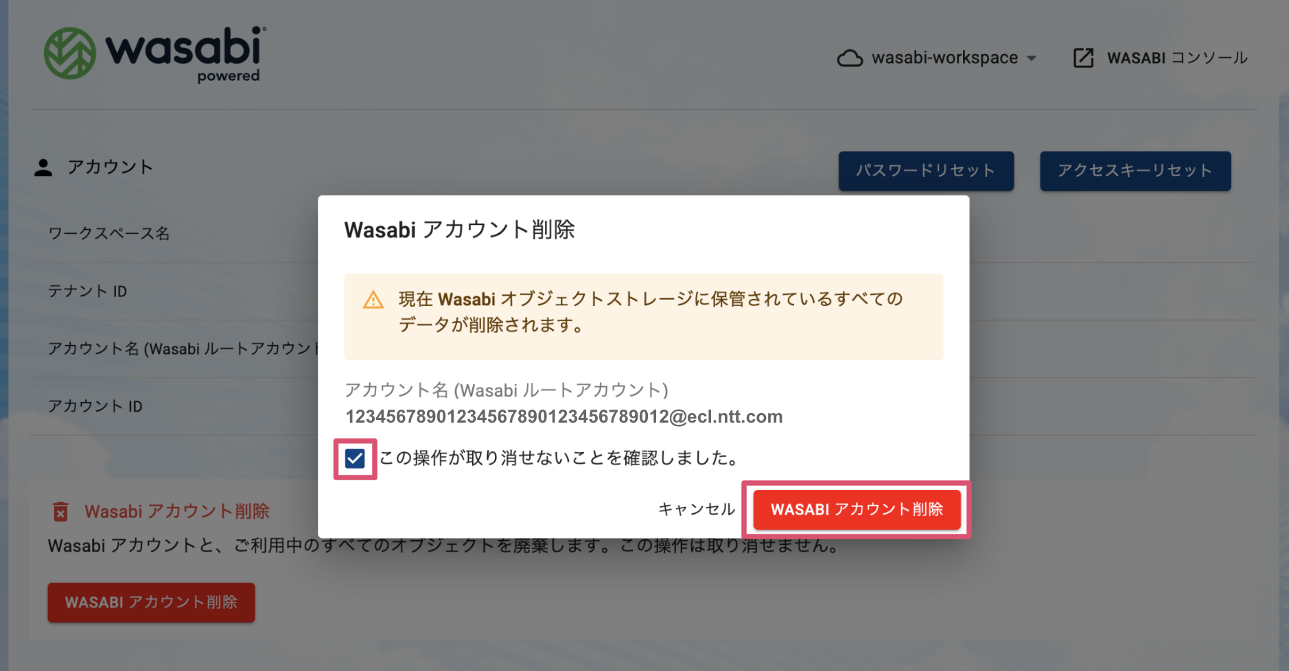 Wasabi アカウント削除ダイアログの内容をご確認いただき、「WASABI アカウント削除」ボタンを押して下さい。