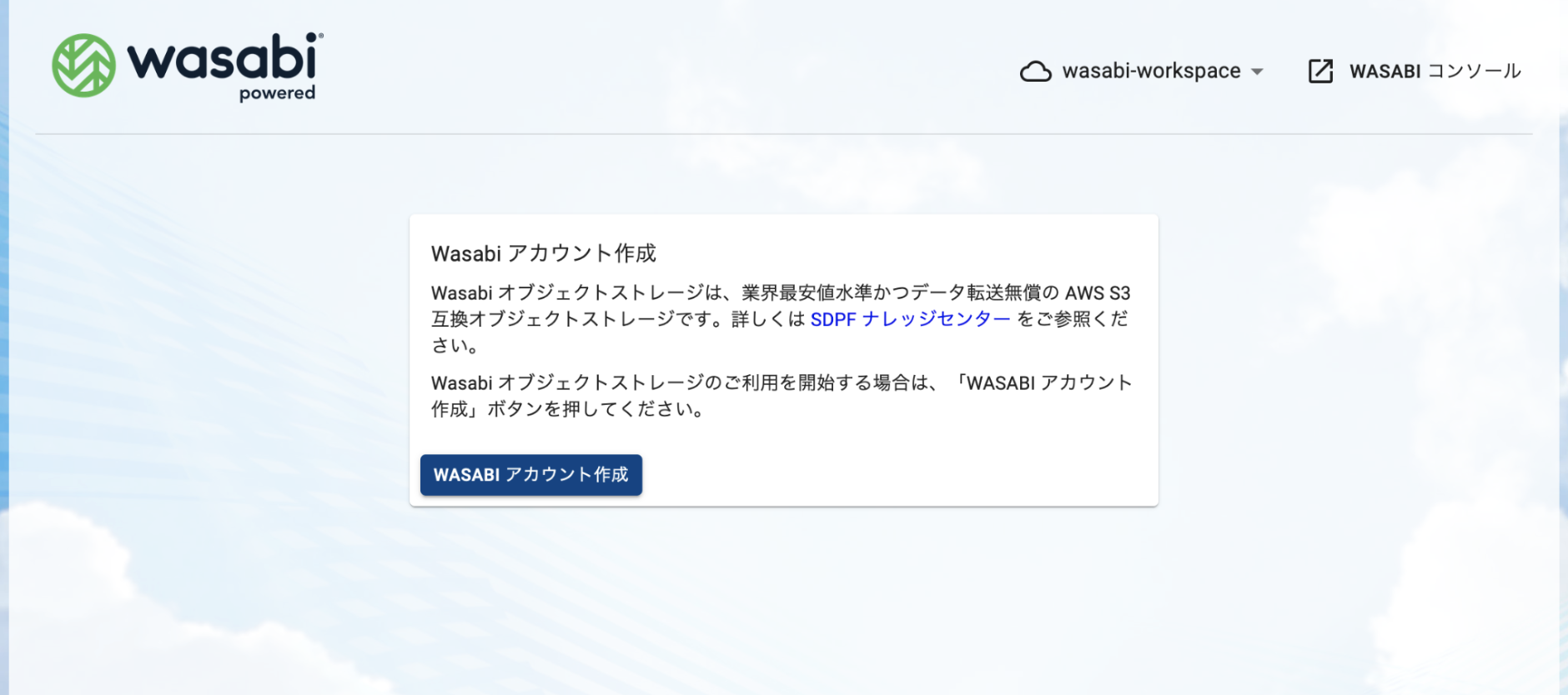 再度、Wasabi オブジェクトストレージをご利用になる場合は、あらためて「WASABI アカウント作成」ボタンを押してください。