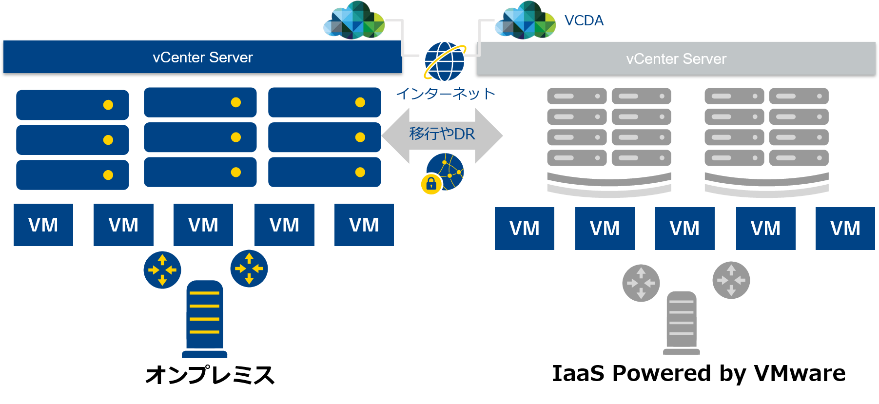 • VCDAを活用し、オンプレミスと同じ構成の仮想マシンをクラウド上に複製した後、切り替えにより段階的に移行が可能。