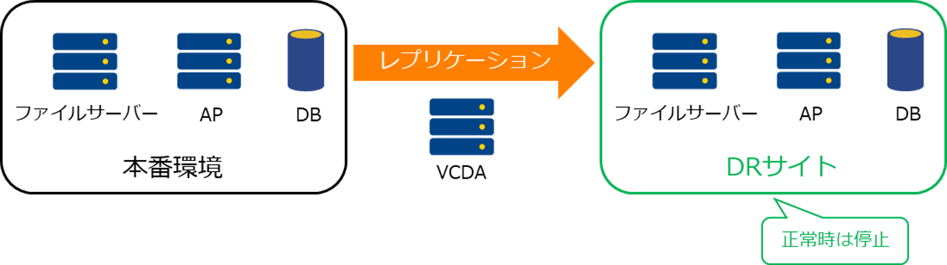 • オンプレミス環境(本番環境)と同じ構成の仮想マシンをMvP環境(DRサイト)に常時レプリケーション取得。